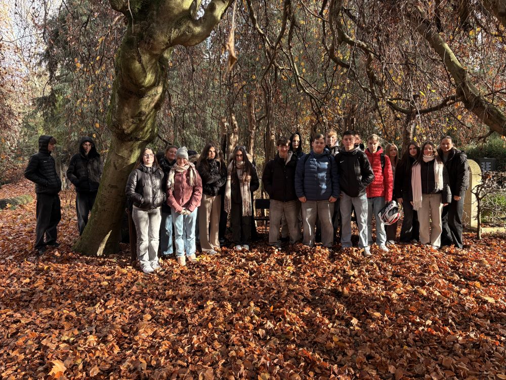 Am 19.11.25 besuchte die 10. Stufe der Realschule Linkenheim den Hauptfriedhof in Karlsruhe und konnte dort bei einem Rundgang die verschiedenen Bereiche des großflächigen, parkähnlich angelegten Friedhofs entdecken. Besonders berührt hat die Schülerinnen und Schüler der Bereich der Kinderwelten, der aus einem zweigeteilten Spielplatz besteht, wobei eine Seite das Leben und die andere den Tod symbolisiert. Auch der Lebensweg, bei dem man die Phasen des Trauerns durchleben kann, war einprägsam. Das Thema Tod und Trauer wurde an diesem Tag auch durch die Besichtigung der verschiedenen Gräberarten und -gestaltungen beleuchtet und findet hier als Unterrichtseinheit ihren Abschluss.