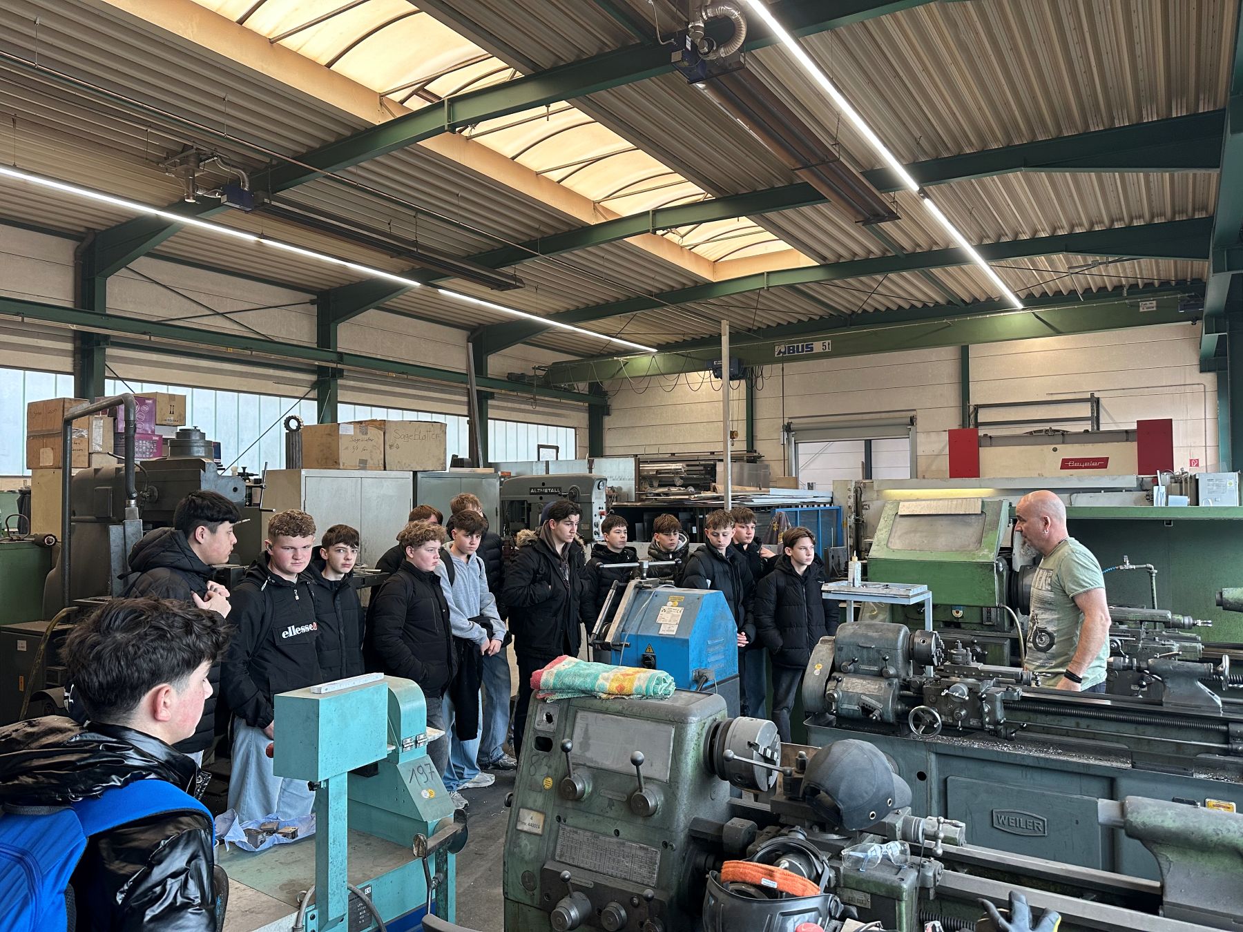 Begrüßt wurde die 20-köpfige Schülergruppe von Firmeninhaber Herrn Herrmann, der den Schülerinnen und Schüler das Unternehmen, die Produktionshalle und verschiedene Ausbildungsfelder der metallverarbeitenden Berufe vorstellte. Hier erkannten die Schüler zu Beginn der Führung sehr schnell, welche Unterrichtsinhalte im Fach Technik auch in der handwerklich-technischen Arbeitswelt zu finden sind. Zum Beispiel die Planung von Projekten mit Hilfe von Konstruktions- und technischen Zeichnungen, die dann in der Verarbeitung ihre technische Umsetzung finden.