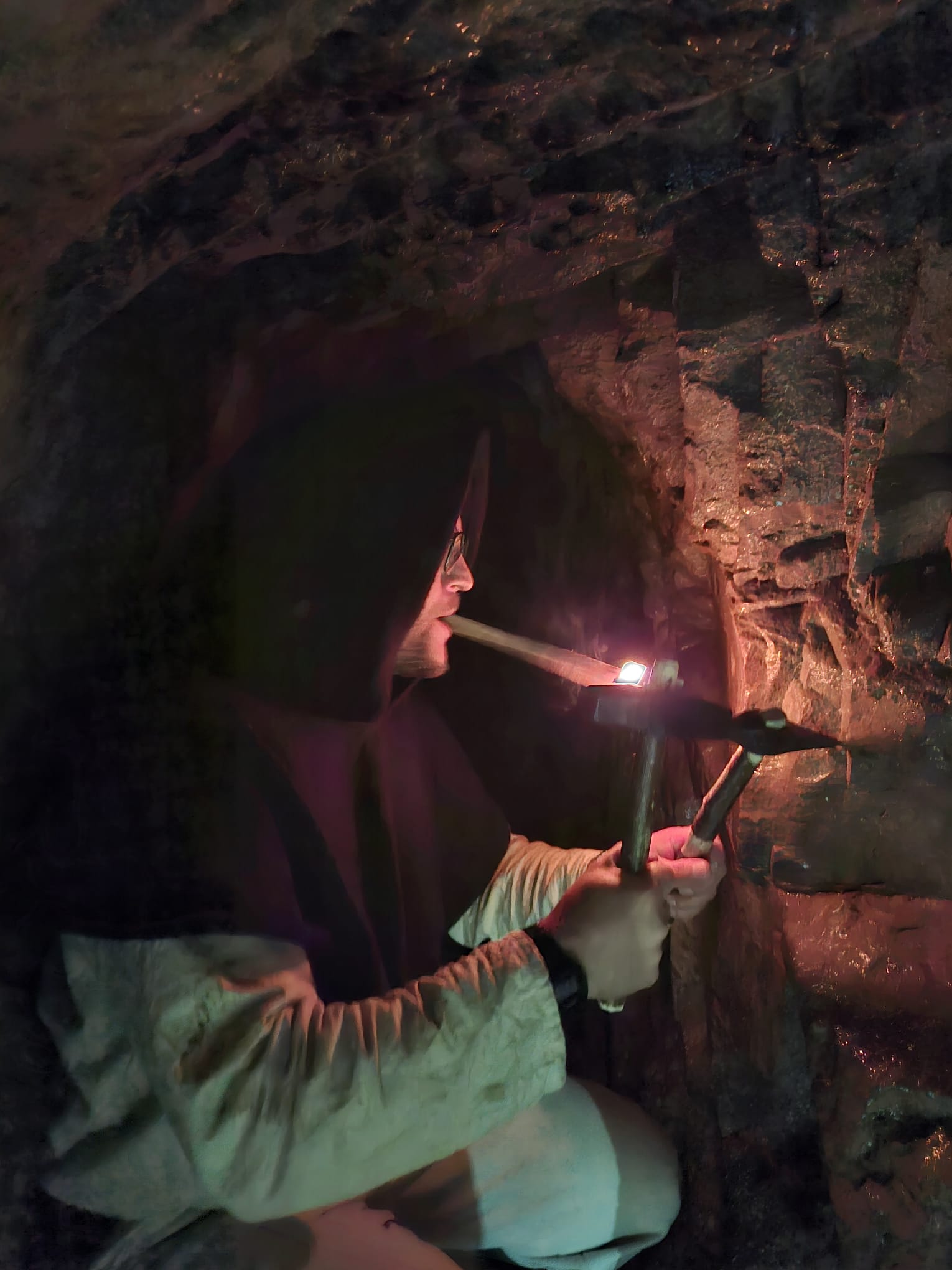 Um die harte Arbeit und vor allem die Umstände unter Tage den Schülern original zu vermitteln, trug Chris Csulits eine originale Arbeitskluft eines mittelalterlichen Bergmanns. Lediglich mit Gugel (Kopfbedeckung), Leinenstoffen und dem sogenannten „Arschleder“ bekleidet und mit Kienspan (mit Harz vollgesogenes Holzstück) und Bergeisen (Meisel) und Schlägel (Hammer) ausgerüstet, wurde den Entdeckern die Arbeit verdeutlicht.