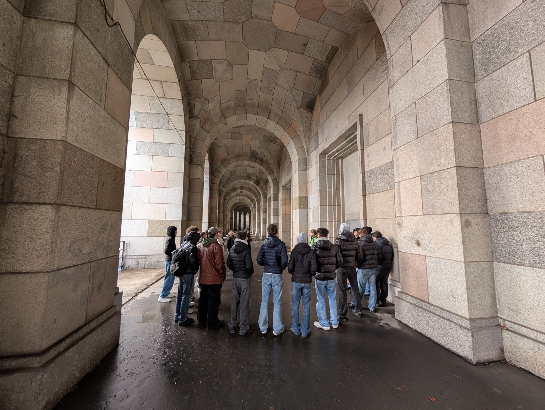 Unmittelbar vor den Faschingsferien machten sich alle drei neunten Klassen auf den Weg nach Oberfranken, um in der im Schloss Schney untergebrachten Franken-Akademie an einer dreitätigen Geschichtsexkursion teilzunehmen. Im Seminarraum der Akademie fand noch am Mittwoch ein Workshop statt, der sich mit dem Thema „Ideologie des Nationalsozialismus“ beschäftigte und damit auf die beiden im Anschluss stattfindenden Fahrten vorbereitete. Die erste führte die Neuntklässler am Donnerstag durch den verschneiten Thüringer Wald zur KZ-Gedenkstätte Buchenwald, wo nach einer Filmpräsentation ein geführter Rundgang auf dem weitläufigen Gelände des Konzentrationslagers stattfand. Die Schüler erfuhren hierbei, wie die menschenverachtende Ideologie der Nazis konkret in die Tat umgesetzt wurde und welche Auswirkungen diese auf die Insassen hatte. Anhand der architektonischen Besonderheiten wurde das Lagerleben und -sterben greifbar und die Teilnehmer konnten sich ein persönliches Bild von einem der größten KZ auf deutschem Boden machen. Am letzten Tag der Reise wurde in Nürnberg ein Zwischenhalt gemacht, um das ehemalige Reichsparteitagsgelände der Nationalsozialisten zu erkunden. Vor der Kulisse der gigantischen Kongresshalle startete die Führung, die um den Dutzendteich führte und dabei Station an der Großen Straße und dem Zeppelinfeld machte. In einem kurzweiligen Vortrag wurden anhand der Bauwerke die größenwahnsinnigen Ideen der Nationalsozialisten aufgezeigt, die auch heute noch das Stadtbild in diesem Bereich Nürnbergs prägen.