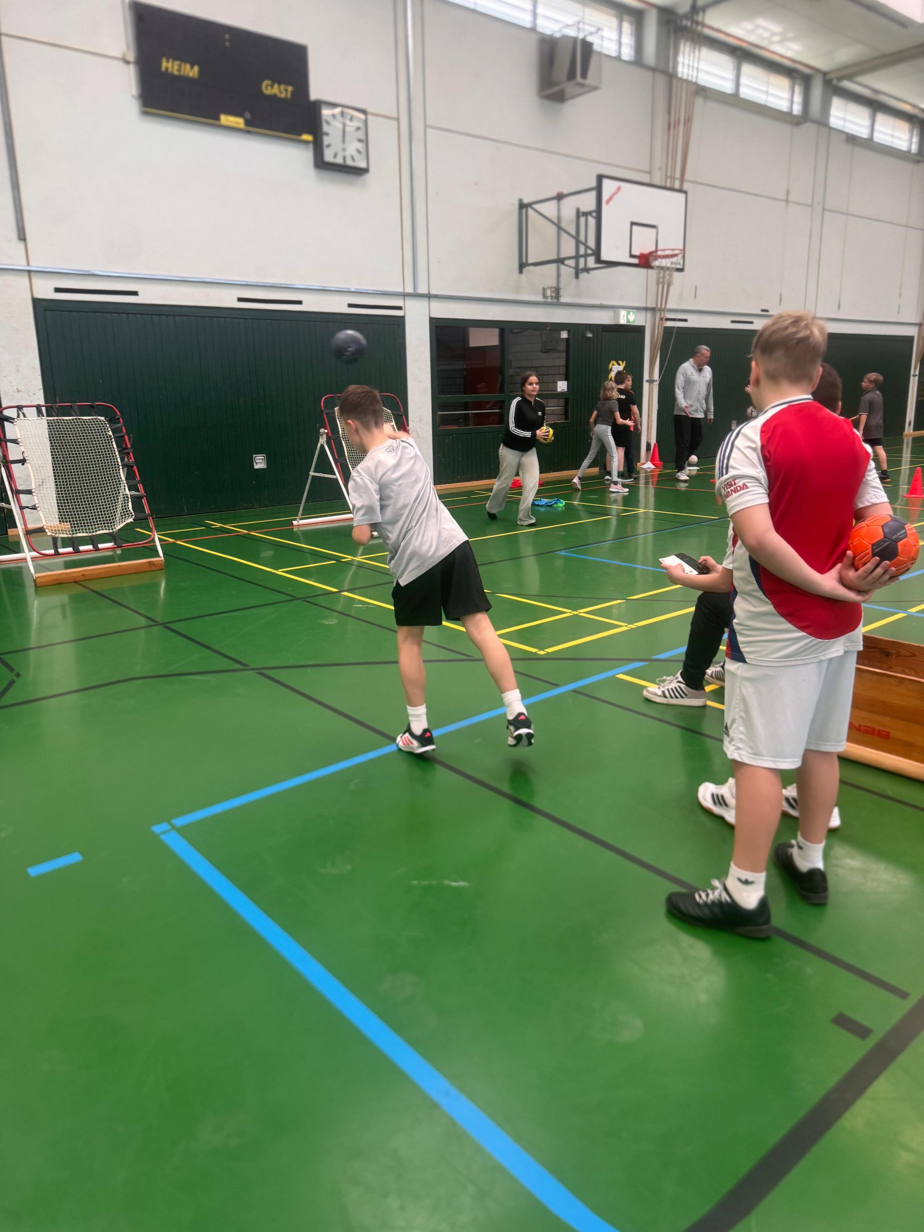 Am 27.02.26 fand nach einjähriger Pause in Zusammenarbeit mit der Handball-Sportgemeinschaft Linkenheim/Hochstetten/Liedolsheim für unsere Sechstklässler wieder ein Aktionstag statt. An abwechslungsreichen Stationen konnten die Schülerinnen und Schüler ihr Können im Umgang mit dem Ball zeigen. Zuerst stand ein Warm-up auf dem Programm, um dann gut aufgewärmt in den Stationen-Übungsbetrieb überzugehen. An den unterschiedlichen Stationen mit verschiedenen Schwerpunkten, wie Wurftechnik, Prellen des Balles und vielem mehr, lernten unsere Schülerinnen und Schüler die Grundfertigkeiten des Handballspiels kennen.